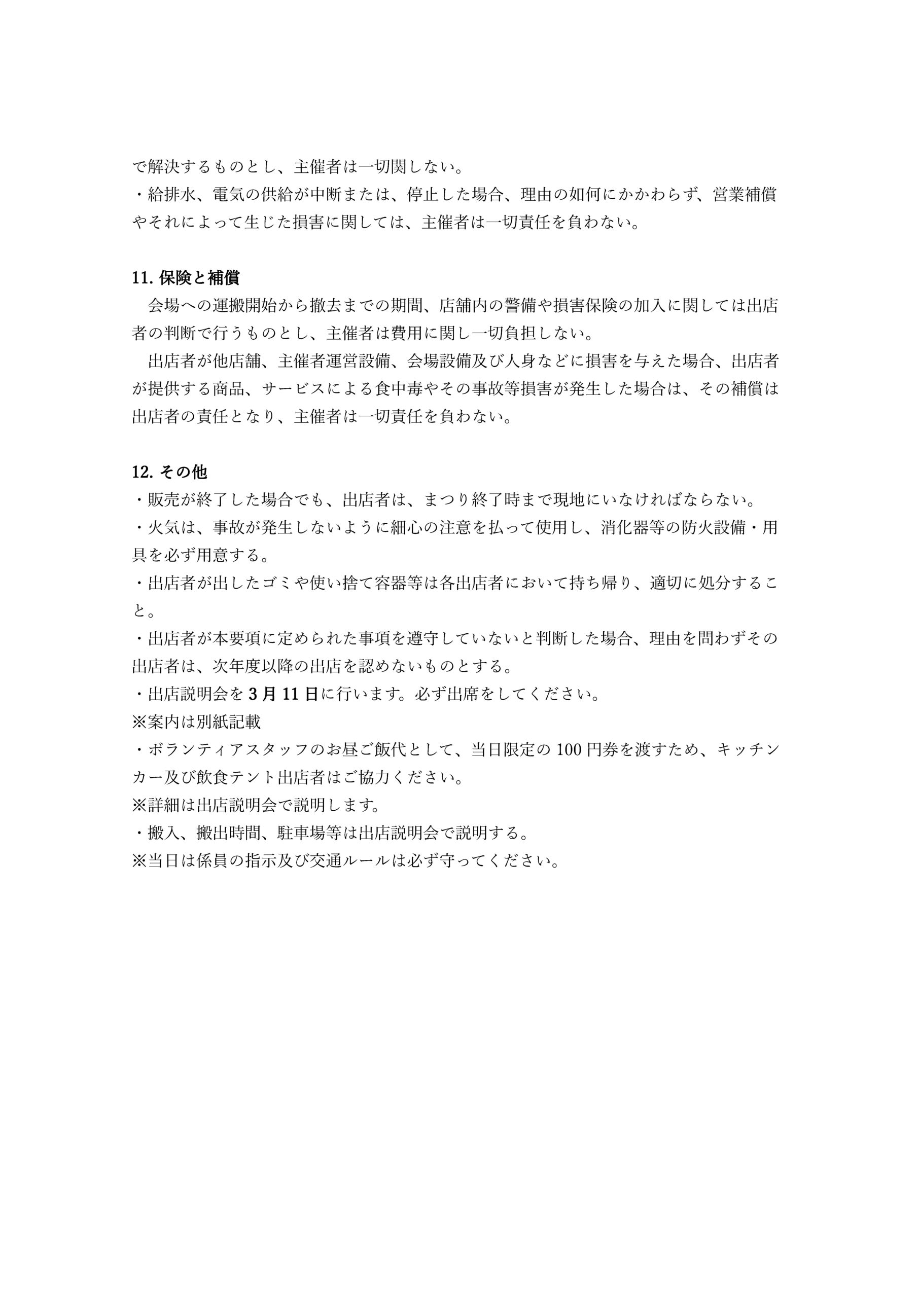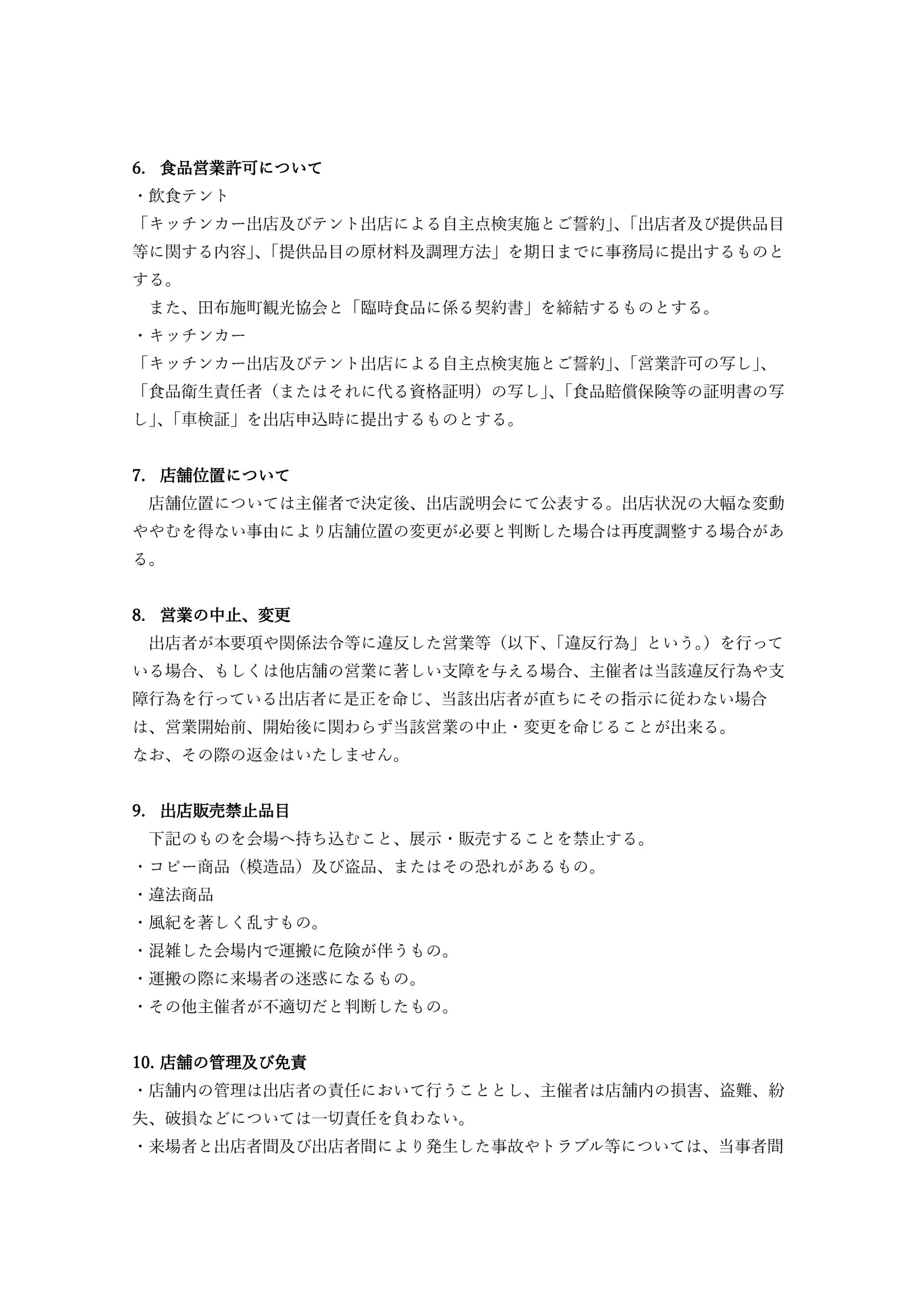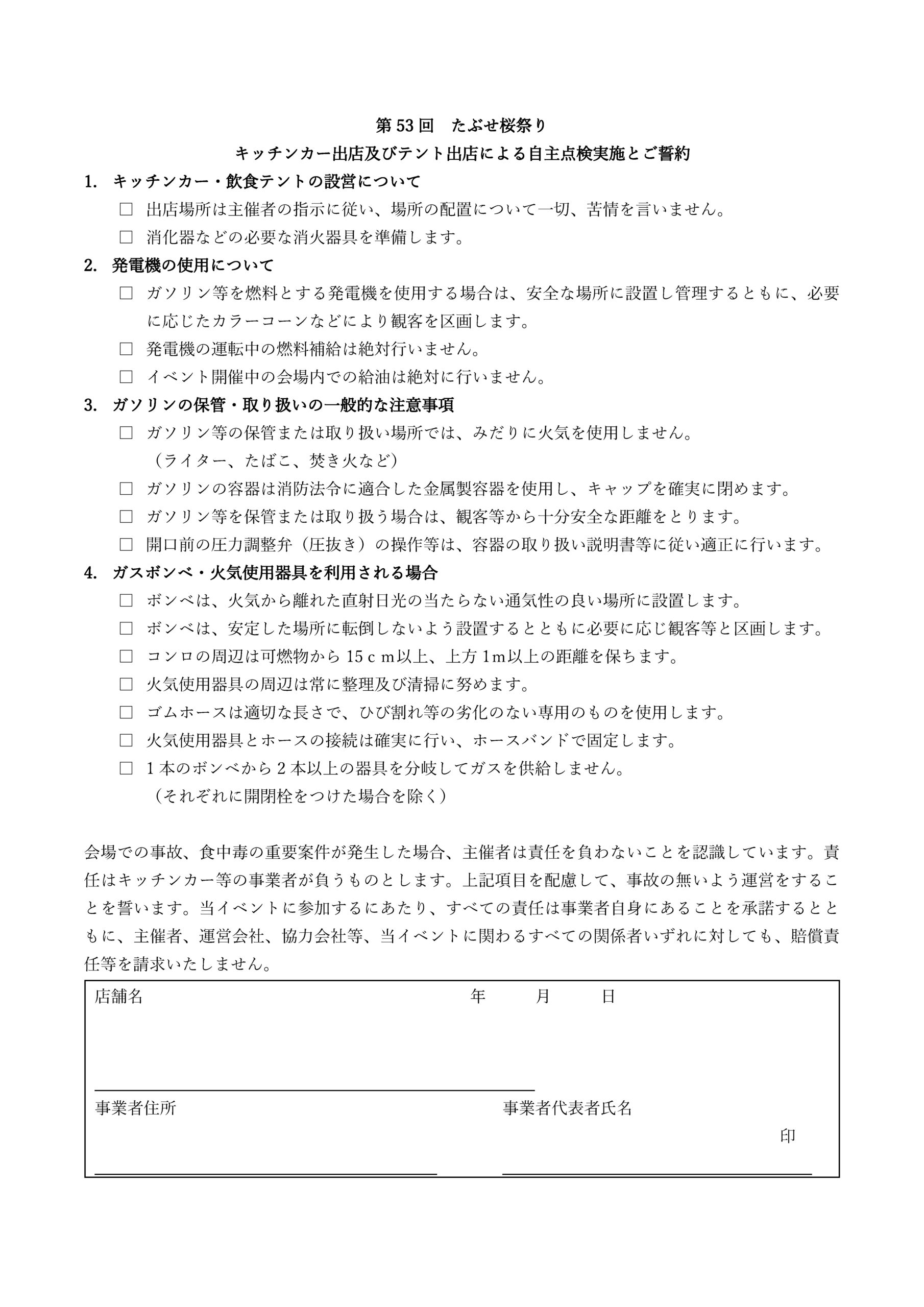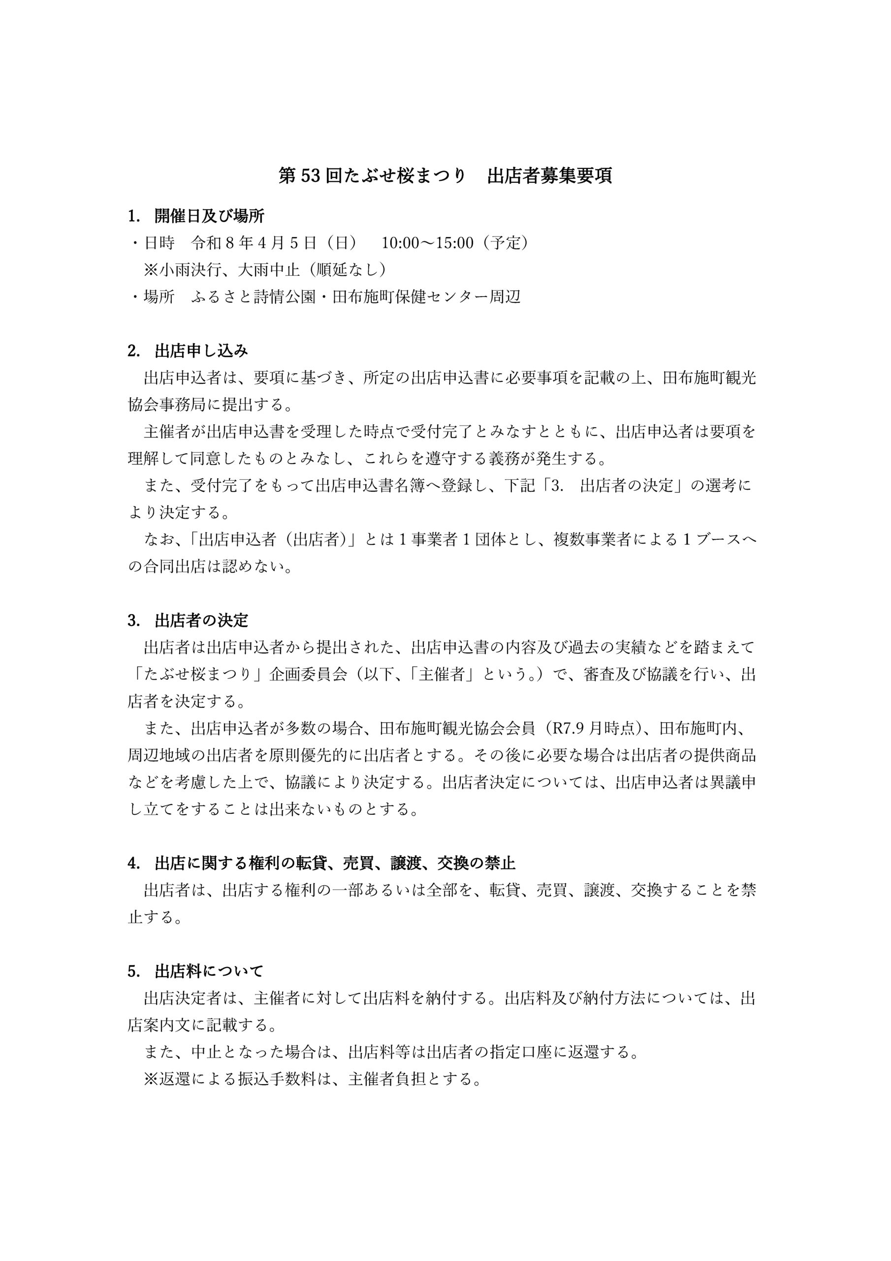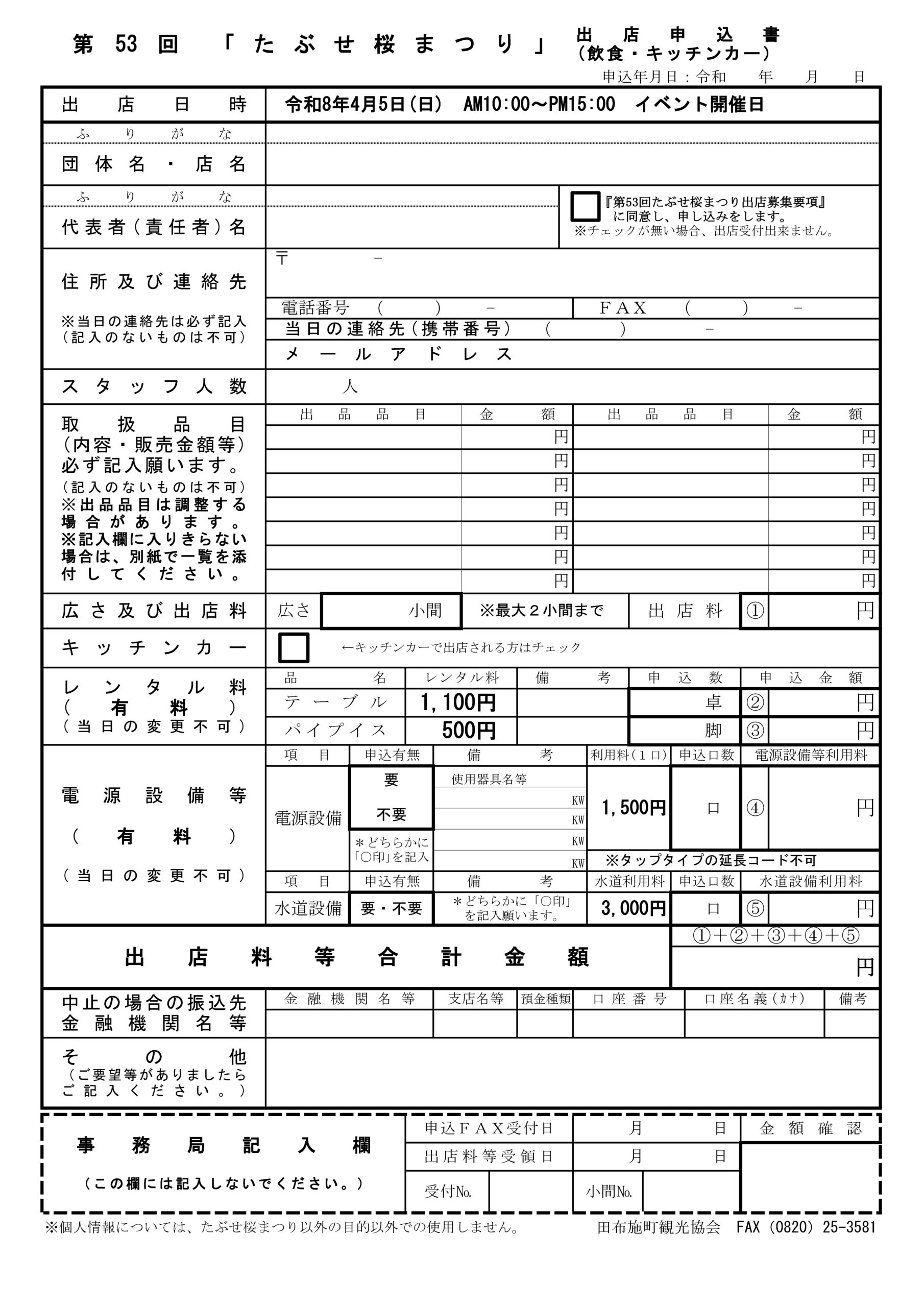 第53回たぶせ桜まつり出店者募集 2026年1月27日 / 第53回たぶせ桜まつり出店者募集 第53回を迎えるたぶせ桜まつりの出店者を募集します。・日時 令和8年4月5日(日) 10:00~15:00(予定)※小雨決行、大雨中止(順延なし)・場所 ふるさと詩情公園・田布施町保健センター周辺 2.出店料 ① 飲食テントブース(田布施町事業者で会員様のみのご案内) 1区画(間口2.7m×奥行3.6m)あたり 13,000円 ※申し込みは各出店者最大2区画までとする。 ② キッチンカー(15~18台予定) 1台あたり(スペースは最大7m)まで 13,000円 電気・水道等は各自で用意するものとする。 ③ 雑貨等販売(14ブース予定) 1区画(3.3m×3.3m) あたり6,000円 ※申し込みは各出店者最大2区画までとする。 ※テント等は各自持ち込みとする。 出店申し込み方法 詳しい内容は出店募集要項をご覧ください。出店説明会を3月11日に行います。必ず出席をしてください。※ 出店者募集は先着順ではありません。期日内に出店募集用紙にご記入のうえ 田布施町観光協会まで提出をお願いします。FAX(0820-25-3581)またはご持参願います。※会場スペースに制限があるため、応募多数の場合は出店内容をもとに当協会で協議したうえ選考させていただきます。申込締切 : 2月9日(月)16時 出店者への通知: 2月17日(火) メールにて出店の可否を通知いたしますので、届いていない場合はお手数ですが、観光協会事務局までご連絡をお願いします。 申請資料ダウンロード pdfファイルとjpgデータは同じものです。ご都合のよろしいほうをダウンロードしてください。 第53回たぶせ桜祭り出店者募集要項 pdf(796KB) jpg①(1.5MB) jpg②(1.9MB) jpg③(2MB) jpg④(1.7MB) 出店(テント・キッチンカー)申込書 pdf(220KB) jpg(3.2MB) 出店(物販)申込書 pdf(186KB) jpg(2.7MB) 第53回たぶせ桜祭り(キッチンカー及びテント出店誓約書) pdf(463KB) jpg(2.4MB) 臨時食品営業に係る契約書 pdf(80KB) jpg(1.6MB)